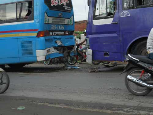 Hơn 100 công nhân trên 3 xe khách hoảng hồn khi 1 trong 3 chiếc mất lái tông vào hai xe c̣n lại. Vụ tai nạn xảy ra vào 6h30 ngày 14/6, trên tỉnh lộ 10 (đoạn gần cầu Tân Tạo, P.Tân Tạo, Q.B́nh Tân, TP.HCM).