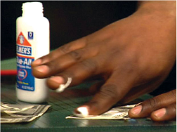 | Dung  dịch rửa là nước pha viên vitamin C được nghiền tan hoặc nước trái mâm  xôi để lạnh (ảnh trái).Lớp đen được rửa và tờ USD thật sẽ về trạng thái  ban đầu (ảnh phải). |