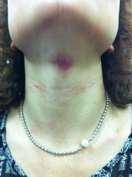 Vết thâm tím do bị hành hung trên cổ bà Hạnh