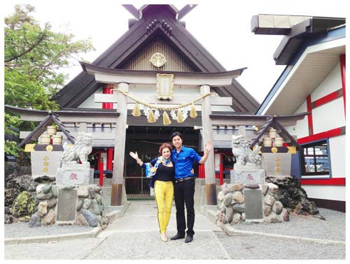 Sau khi đi thăm quan chùa Sensoji, tháp Tokyo và bên ngoài hoàng cung Nhật Bản, công viên Disneyland, Vũ Hoàng Việt và "bồ già" còn có những trải nghiệm khó quên khi đi thăm núi Phú Sĩ.