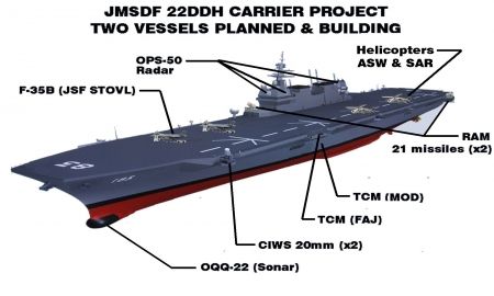 Song song với nó, để phát triển năng lực tấn công trên biển, Nhật cũng phải cân nhắc khả năng mua sắm máy bay chiến đấu cất cánh trên đường băng ngắn và hạ cánh thẳng đứng F-35B. Hiện Bộ Quốc phòng nước này đã quyết định đóng 2 tàu sân bay trực thăng lớp 22DDH, nên có đầy đủ phương tiện chuyên chở để làm bệ phóng cho loại máy bay này. Khi đó, 22DDH sẽ trở thành vũ khí mà Trung Quốc ngán ngại nhất trong tranh chấp biển đảo.