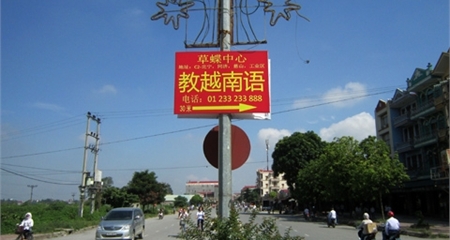 Quảng cáo dạy tiếng Trung, Việt hầu hết bằng chữ Trung Quốc trên một con phố thuộc phường Đồng Kỵ.