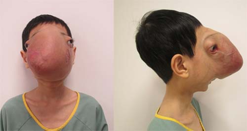 Khối u phát triển ngày càng lớn, chiếm gần như toàn bộ gương mặt, đẩy 2 mắt về 2 phía vùng, miệng và mũi bị lệch khiến khuôn mặt biến dạng hoàn toàn.