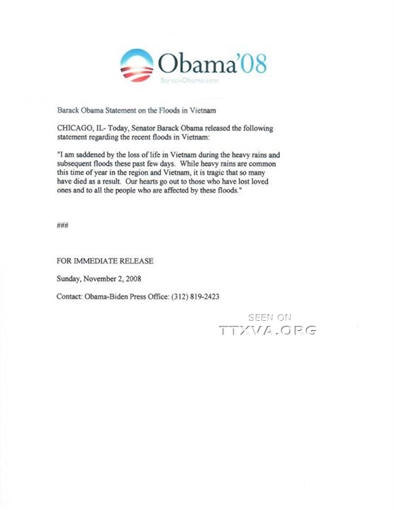 Hai ngày sau TNS Barack Obama đắc cử Tổng Thống Thứ 44 của Hoa Kỳ vào ngày 04-11-2008. Đây là vị Tổng Thống Da Màu đầu tiên, có trái tim đỏ thắm tình người; có tấm lòng nhân ái và luôn nghĩ đến những kẻ nghèo khó, những dân tộc bị áp bức; và có tình thương đối với đồng bào ruột thịt Việt Nam của tôi nên tôi nhiệt tình hỗ trợ cho TT Barack Obama trong hơn 5 năm qua.