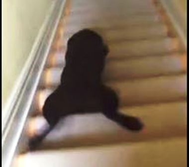 Đoạn clip ghi lại cảnh một chú chó thích trượt xuống cầu thang bằng phần bụng khiến người xem bật cười và thích thú.