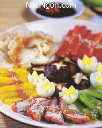 – Xếp ớt chuông, nấm, trứng và thịt vịt vào đĩa thành từng cụm nhỏ. rưới nước sốt dầu hào và rất vừng lên mặt.