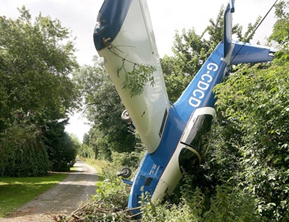 Phi công người Anh Alan Bray chỉ bị trầy xước ngón tay cái, khi chiếc máy bay thể thao của anh “bổ nhào” xuống đất v́ hỏng động cơ.
