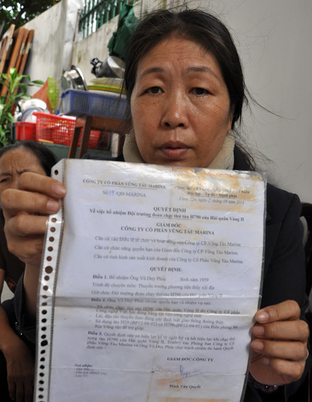Bà Trần Thị Phương Nở, vợ tài công canô bị chìm Phạm Duy Phúc, và quyết định của Vũng Tàu Marina về việc điều động ông Phúc sử dụng tàu H29BP đang sửa chữa tại Việt - Séc - Ảnh: ĐÔNG HÀ
