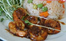 Úp cơm ra đĩa, xếp tôm bên cạnh, rưới nước tiết ra trong khi xào tôm lên trên.