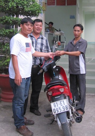 Anh Sứ (bên phải) vui mừng khi nhận lại chiếc xe máy.