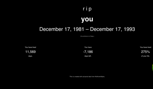 Sử dụng các dữ liệu từ Wolfram|Alpha, website này sẽ tính toán thời điểm c̣n sống của mỗi người dựa vào độ tuổi, giới tính, quốc gia sinh sống.