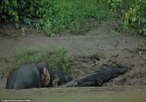 Mẹ con voi thoát khỏi bùn lầy lên bờ sau nhiều nỗ lực của cả hai.