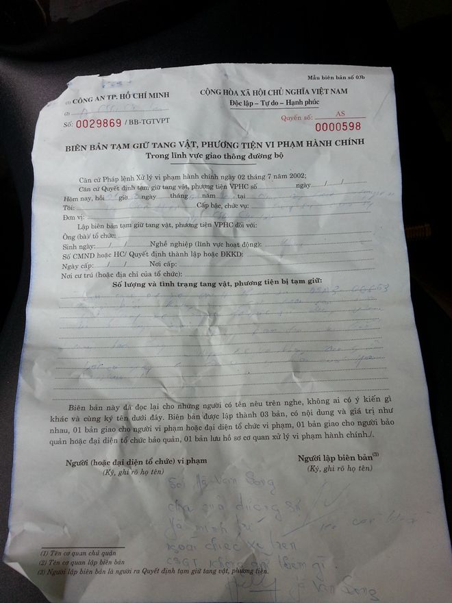 Về trụ sở CSGT Trí không kư vào biên bản vi phạm, không xuất tŕnh được bằng lái A2, bảo hiểm xe và giấy CMND cá nhân mà chỉ xuất tŕnh được giấy đăng kư xe mang tên ông Nguyễn Hoàng Hải (ngụ quận Phú Nhuận)