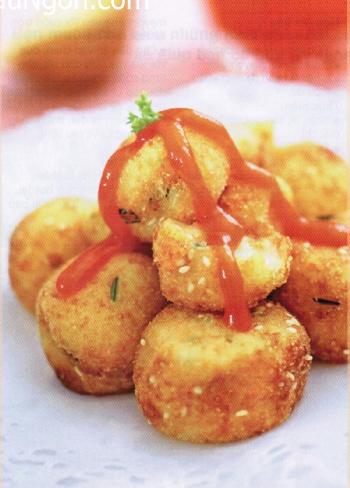- Để hỗn hợp bột và khoai tây nghỉ khoảng 5 phút, bạn mới vo thành từng viên tròn cỡ quả quất. Sau đó, lăn vào hỗn hợp bột xù và vừng.