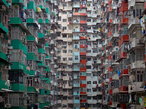 Bộ ảnh “Architecture of Density”, tạm dịch là “Kiến trúc và Mật độ” do nhiếp ảnh gia Michael Wolf thực hiện cho thấy các khu chu cư đông đúc nằm chen chúc giữa những ṭa nhà chọc trời, với quần áo phơi đầy các cửa sổ và ban công.