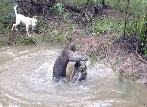 Chú chó tiến tới chơi đùa nhưng không biết rằng Kangaroo là một đấu sĩ chuyên nghiệp và cố tình dìm chết mình trong nỗ lực phòng ngự