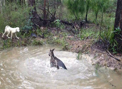 Chú chó giống Đức tiến lại gần chú kangaroo trong một hố nước
