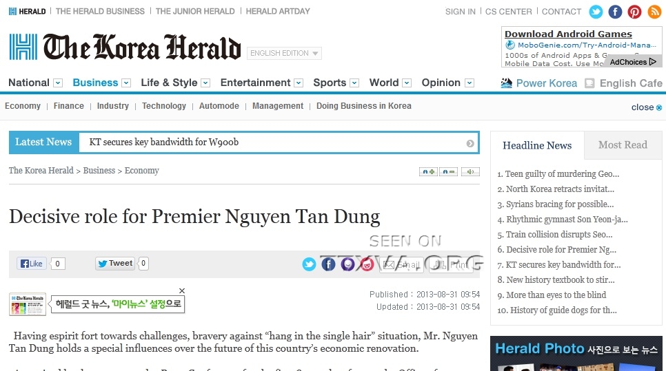 Tờ The Korea Herald của Hàn Quốc ngày 31/8 viết: Bản lĩnh khi đối diện với khó khăn, quả cảm trước những vấn đề “ngàn cân treo sợi tóc”, ông Nguyễn Tấn Dũng là vị thủ tướng có tầm ảnh hưởng hết sức quan trọng đối với công cuộc đổi mới tại đất nước này.