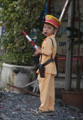 Đang chạy trên đường, nhiều người giật mình vì tiếng còi “tuýt” và té ngửa với chú nhóc trong trang phục nón, gậy Công an rất...chuyên nghiệp.