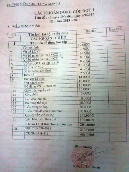 Một phụ huynh tên H phản ánh: “Trong buổi họp phụ huynh ngày 29/8 có nhiều khoản tôi không đồng ý đóng vì quá cao. Hôm sau 30/8, cô giáo có gọi điện yêu cầu ký đồng ý. Nếu không đồng ý cô sẽ giữ cháu ở lại trường. Thực tế tôi đã nhờ hai người nhà ra đón nhưng cô không trả cháu. Sau con khóc quá tôi đành ký vào để đón con về”.