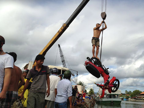 Chiều cùng ngày, cơ quan chức năng đã cho cẩu chiếc xe lên và tiếp tục truy tìm người thanh niên liều lĩnh trên để xử lý.