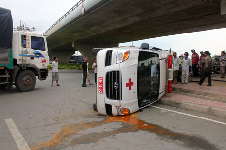 Một chiếc xe cứu thương đang trên đường đi đón bệnh nhân đã bị một xe tải tông lật làm hai người trên xe bị thương nặng phải vào bệnh viện Chợ Rẫy cấp cứu trong tình trạng nguy kịch.