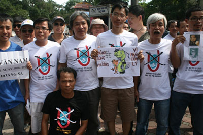 Luật sư Lê Quốc Quân (thứ hai bên trái, mặc áo thun trắng 'No U') tham dự cuộc biểu t́nh chống Trung quốc bá quyền bành trướng tại Hà Nội ngày 24/7/2011. (H́nh Lê Quốc Quân Blogspot)