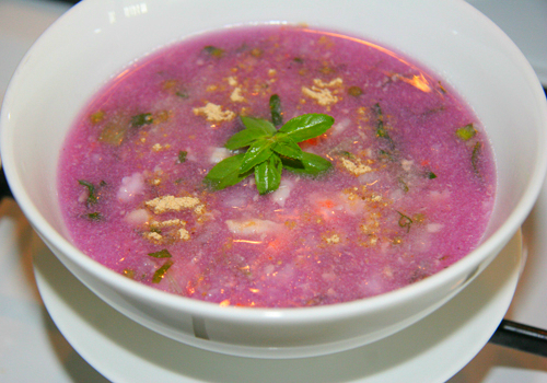 - Cho nước vào xâm xấp rồi đun sôi, sau đó cho khoai mỡ vào nấu chín mềm. Tiếp đến cho bát nước tím của vỏ khoai vào, nêm lại gia vị cho vừa ăn.