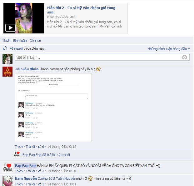 Hành động khoe khoang của cô gái tự nhận mình là ca sỹ Mỹ Vân đã vấp phải sự phản đối của cộng đồng mạngBạn Vuonghai cho rằng: Thực sự mình rất ghét những loại người lấy người khác ra làm trò đùa và cợt nhả.