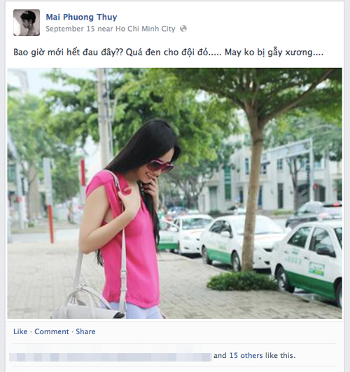 Chia sẻ lên Facebook cá nhân, Hương Tràm buồn bã viết: "Nguyên văn đây là hình ảnh cuối cùng của cái điện thoại thân yêu của em. Mọi người ai đi qua Nguyễn Thiện Thuật - quận 3 (TP.HCM) thì nhớ ngó trước ngó sau và không đeo túi xách nhé. Đừng ai gặp anh chàng đáng yêu đội mũ bảo hiểm đi xe tay ga thích giật túi xách ấy nữa nhé".