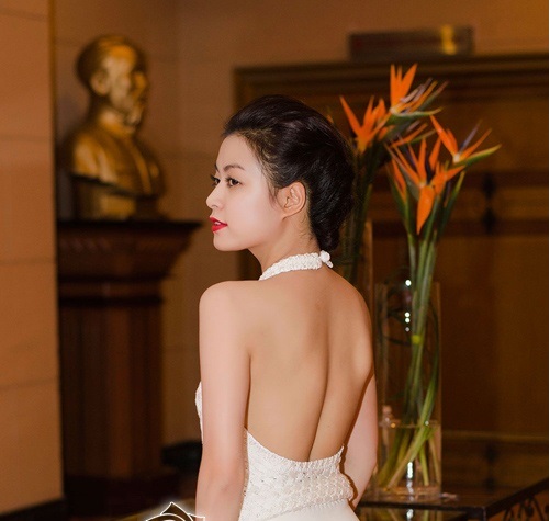Default Hoàng Thùy Linh bẽn lẽn váy trắng khoe lưng trần