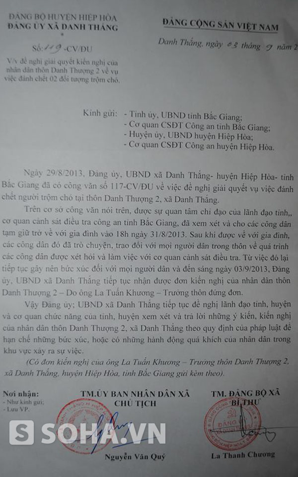 Trước những ư kiến này và theo yêu cầu của người dân, ông La Tuấn Khương đă có đơn kiến nghị gửi cơ quan chức năng trong tỉnh đề nghị làm rõ việc làm của cán bộ điều tra Công an tỉnh Bắc Giang là sai hay đúng, nếu sai xử lý thế nào. Cùng với đơn của ông Khương, ông La Thanh Chương, Bí thư Đảng uỷ, Chủ tịch HĐND và ông Nguyễn Văn Quư, Chủ tịch UBND xă Danh Thắng cho biết, Đảng ủy và UBND xã Danh Thượng, Hiệp Hòa, Bắc Giang cũng đă có văn bản gửi Tỉnh ủy, UBND tỉnh Bắc Giang, Cơ quan cảnh sát điều tra Công an tỉnh Bắc Giang, Công an huyện Hiệp Hòa đề nghị làm rõ kiến nghị của người dân xã Danh Thượng 2 về việc đánh chết 2 đối tượng trộm chó.