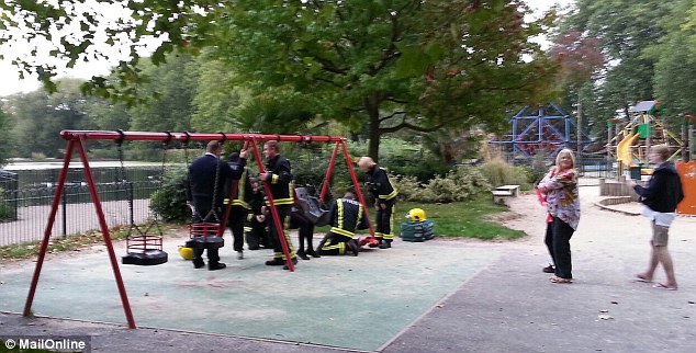 Cô gái chơi trò chơi ở chiếc xích đu ở công viên Finsbury, phía Bắc London, chiều ngày hôm qua nhưng không thể xuống được và phải nhờ trợ giúp.