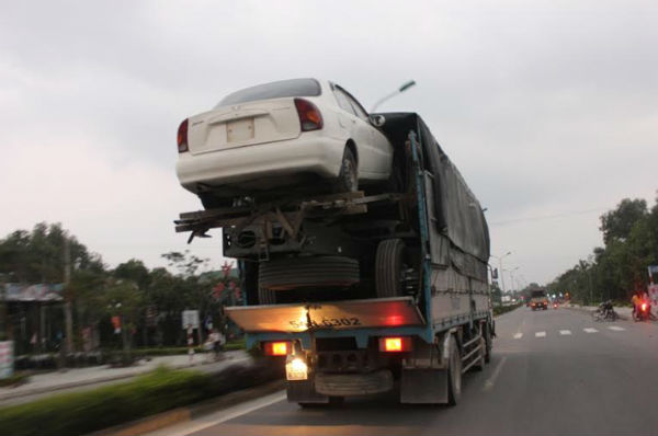 Chiếc xe mang BKS 54N – 6302 chạy hướng Bắc – Nam, thùng xe chở một xe tải loại nhỏ hơn có thừa phần đuôi xe ra ngoài. Chưa hết, chủ xe con chở kèm thêm một xế hộp 4 chỗ phía trên. Hầu như toàn thân chiếc xe con lọt hẳn ra ngoài trông rất nguy hiểm.