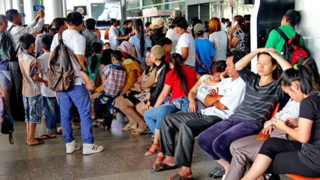 Hàng trăm hành khách ngồi chờ tại sân bay Quốc tế.