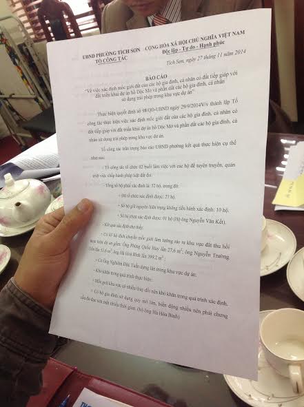 Theo như lời chủ tịch UBND phường Tích Sơn thì từ năm 2011-2012, phường đã mời các hộ gia đình lên làm việc và ký thỏa thuận không lấn chiếm đất công, trong đó có cả hộ gia đình ông Hà Hòa Bình.