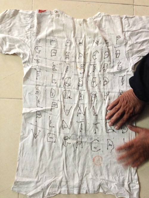 Đôi bàn tay run run, ông lôi từ trong bọc vải ra chiếc áo trắng cũ kỹ có những dòng chữ được thêu nguệch ngoạc với dòng mở đầu “Chưởng vô tội”.