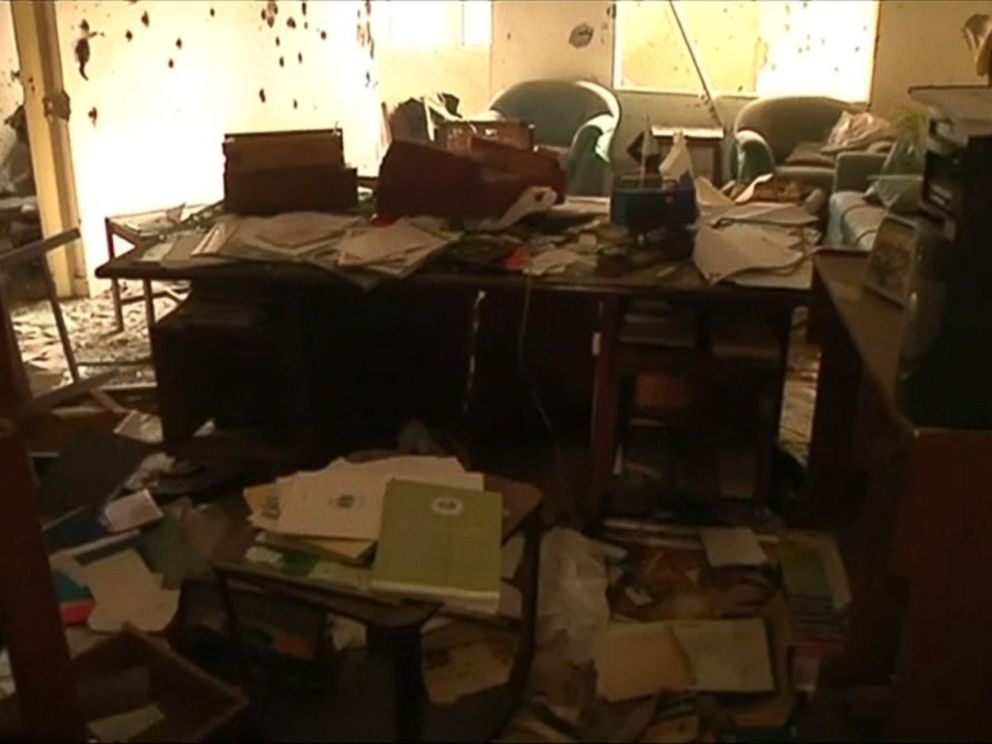 Phòng của hiệu trưởng bị lục tung, nội thất bị xé rách.