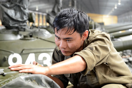 Thiếu úy Hoàng Ngọc Biên, Đội trưởng Đội Bảo quản xe tăng, thực hiện bảo quản xe niêm cất.