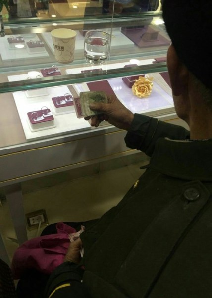 Zhou Lanlan, một nhân viên tại cửa hàng kể lại, hai cụ tới cửa hàng vào khoảng trưa ngày 17/12. Cụ ông muốn mua một chiếc nhẫn kim cương với giá “hợp túi tiền” cho cụ bà. Cụ ông 80 tuổi, sống tại Tân Cương, Trung Quốc mặc một chiếc áo khoác màu xanh đậm, đội một chiếc mũ. Cụ bà mặc chiếc áo màu kẻ và trùm khăn.