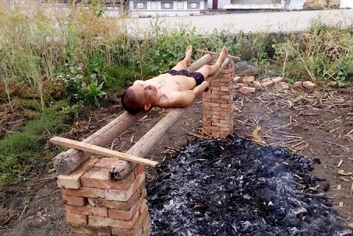 Jia đã thu thập các nhánh cây khô và mùn cưa để đốt lửa tự “nướng” mình, anh cũng cho biết đã canh sẵn nhiệt độ sao cho bản thân chịu đựng được, rồi mới nằm lên thanh ngang phía trên đám lửa.