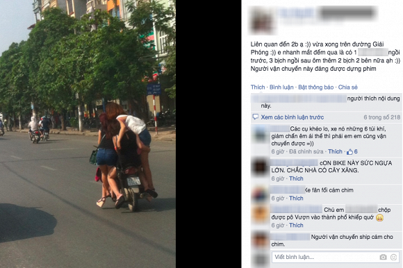 Chắc hẳn đã là người Việt Nam thì chúng ta không còn xa lạ gì về hình ảnh các thanh niên chở đằng sau tới 4 hay 5 cô gái trên một chiếc xe máy. Điều đáng nói là đã vị phạm chở quá số người quy đinh như vậy nhưng các thanh niên này còn đi với tốc độ cao và lạng lách trên đường gây nguy hiểm cho chính họ và những người cùng tham gia giao thông. Mới đây, cư dân mạng lại lan truyền hình ảnh 6 cô gái trẻ đu trên một chiếc xe máy khiến nhiều người tỏ ra ngán ngẩm.