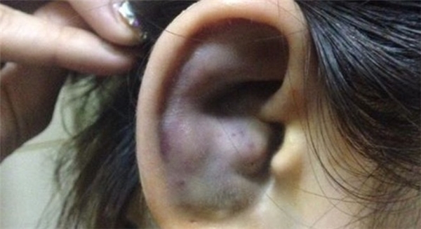 Hình ảnh lỗ tai cô gái bị thâm đen sau khi ăn tiết canh.