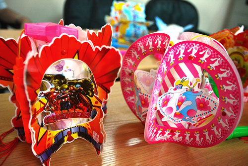 Đèn lồng (bên trái) với hình ảnh các siêu anh hùng là hàng Trung Quốc, có màu sắc lem nhem không rõ ràng, còn loại đèn lồng với hình ảnh nhân vật hoạt hình mèo Oggy (bên phải) có màu sắc hài hòa đẹp hơn rất nhiều.