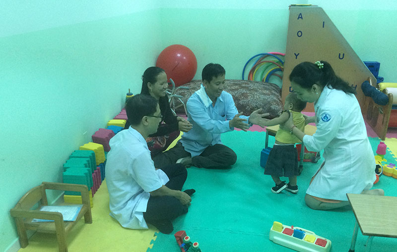 Bé trai văng khỏi bụng mẹ gần 1 năm trước đã trở lại bệnh viện để khám lại. Các bán sỹ đã tận tình đói tiếp bé rất tốt. Mọi theo dõi đếu cho thấy bé phát triển bình thường.Gia đình bé trái cảm thấy rất may mắn vì bé đã có chân giả và có thể tập đi được.