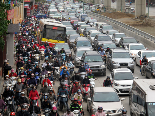 Dù có rất ít xe buýt đi qua giờ cao điểm sáng nay nhưng đường vẫn tắc do có quá đông ô tô cá nhân và xe máy.