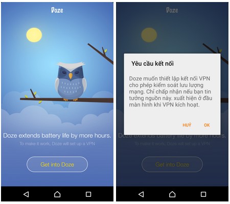 Sau khi cài đặt ứng dụng, bạn nhấn nút “Get into Doze” để kích hoạt chế độ tiết kiệm pin của ứng dụng. Sau khi kích hoạt chế độ tiết kiệm pin này, ứng dụng Doze sẽ thiết lập một mạng ảo (VPN) để quản lý kết nối trên thiết bị, giúp tiết kiệm pin trên thiết bị di động. Nhấn “OK” từ hộp thoại hiện ra để chấp nhận.