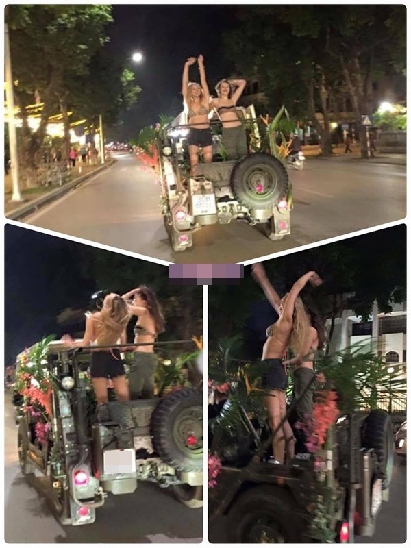 Theo người chia sẻ thì những bức hình này được chụp vào tầm 9g tối 18/12 trên đường Đinh Tiên Hoàng, Hà Nội. Dù thời tiết Hà Nội về tối khá lạnh, thế nhưng 2 nữ khách du lịch này vẫn tự tin diện trang phục khá mỏng và gợi cảm, đứng trên xe jeep nhảy múa.