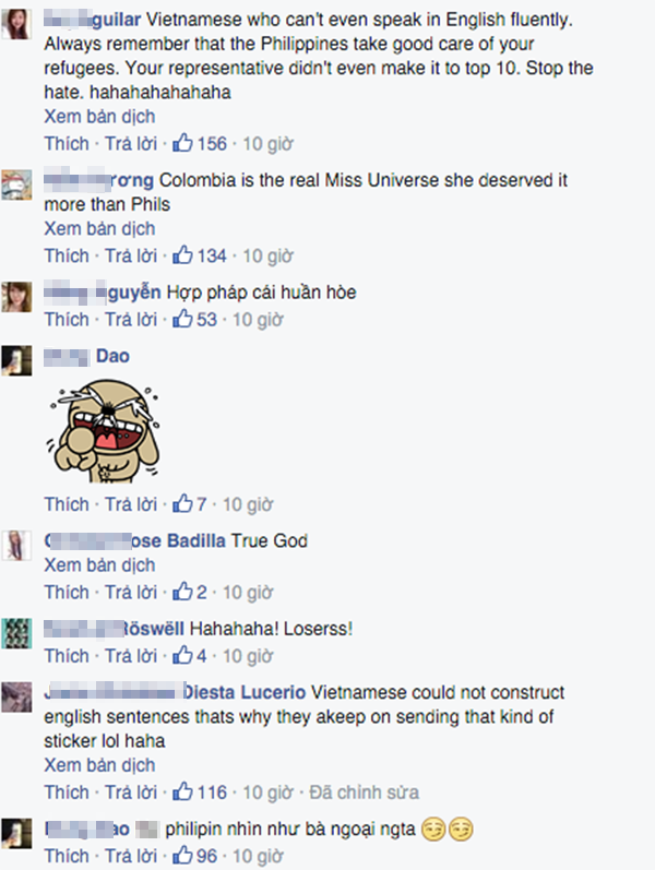 Hiện, trên fanpage Miss Universe có hàng ngàn bình luận của dân mạng Việt, bằng cả tiếng Việt và tiếng Anh. Có thể điểm qua một số bình luận như: "Hoa hậu Philippines nhìn như bà ngoại người ta"; "Tân Hoa hậu Hoàn vũ Miss Universe phải đổi thành Mrs Universe vì Hoa hậu quá già và xấu"; "Phạm Hương mới là số một"...