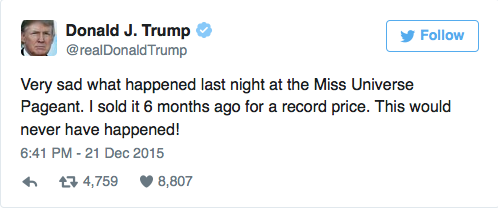 Tỷ phú người Mỹ cũng cho biết trên trang Twitter của mình rằng, sẽ không có sự cố đáng tiếc vừa qua nếu ông vẫn còn liên quan đến Hoa hậu Hoàn vũ: